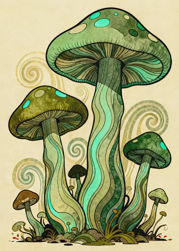 70s PSYCHEDELISCHE Groene Magische Paddenstoel Groovy Schimmels posters & art prints door Mingkly Habibi – Premium Poster – 50×70 Nouvelle Collection
