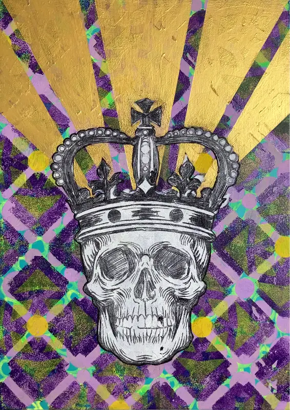 Achat Immédiat Koninklijk Requiem: Een gekroonde schedel in levendige patronen posters & art prints door David Galan – Premium Poster – 50×70