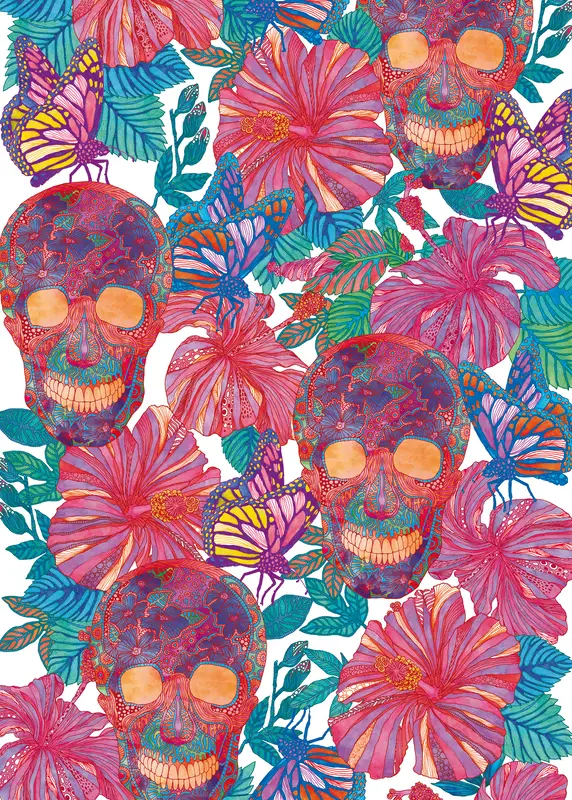 Achat Immédiat Levendig bloemig schedelpatroon: een viering van leven en dood posters & art prints door Nicole Bustamante – Premium Poster – 50×70