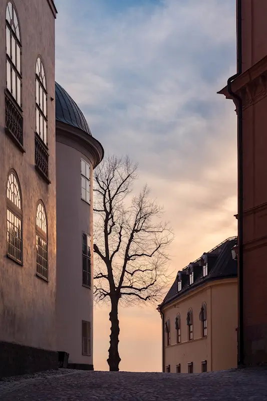 Zonsondergang en boom in oude stad posters & art prints door Jing Liu – Premium Poster – 50×70 Achat Immédiat
